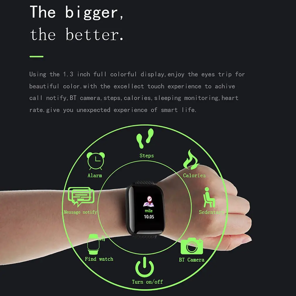 - With a larger 1.3inch display screen, the words are bigger, clearer, and the touch screen with high sensitivity can achieve various operations. Intelligent call reminder, Bluetooth photography, steps, calories, sleep monitoring Bluetooth music, heart rate, fast viewing of various functions, large color screen touch operation more smoothly, from now on.